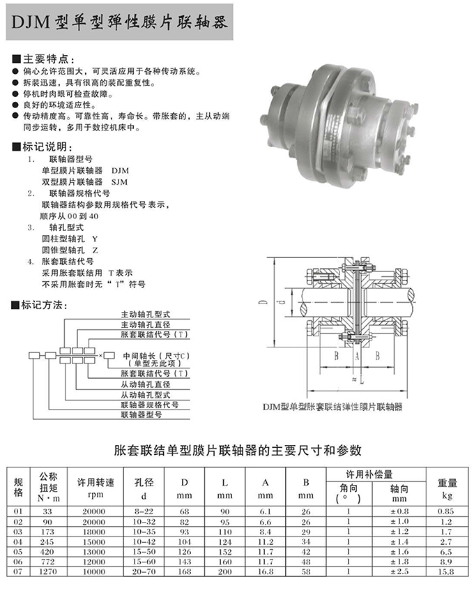 瑞安市寶德隆機械配件有限公司提供DJM型單型彈性膜片聯(lián)軸器具有拆裝方便,快速安裝等特點,廣泛用于連接/固定輪轂孔和零件的軸,例如齒輪,錐齒輪,鏈輪,葉輪,凸輪,皮帶輪和飛輪等軸的聯(lián)結(jié)固定,咨詢電話:18906872378
